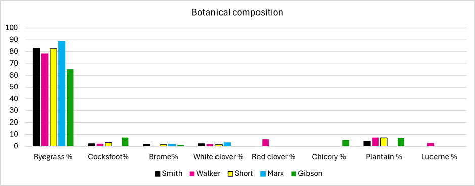 We would like to introduce these partner farms who we have been working alongside Dairy Trust Taranaki since June 2022 and share how winter and spring has been on their farms. As part of the project the botanical composition of their spring pastures have been analysed by Dairy Trust Taranaki. The results are summarised in the figure below.